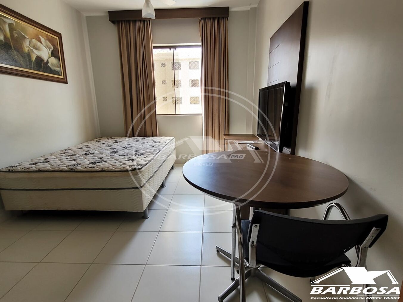 Excelente apartamento de 01 quarto, um banheiro social, sala de TV e cozinha.