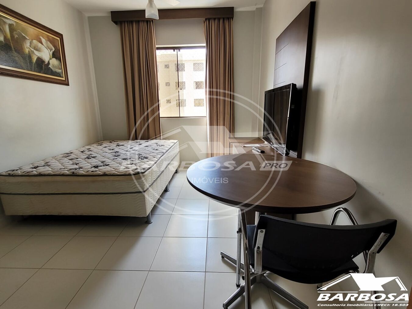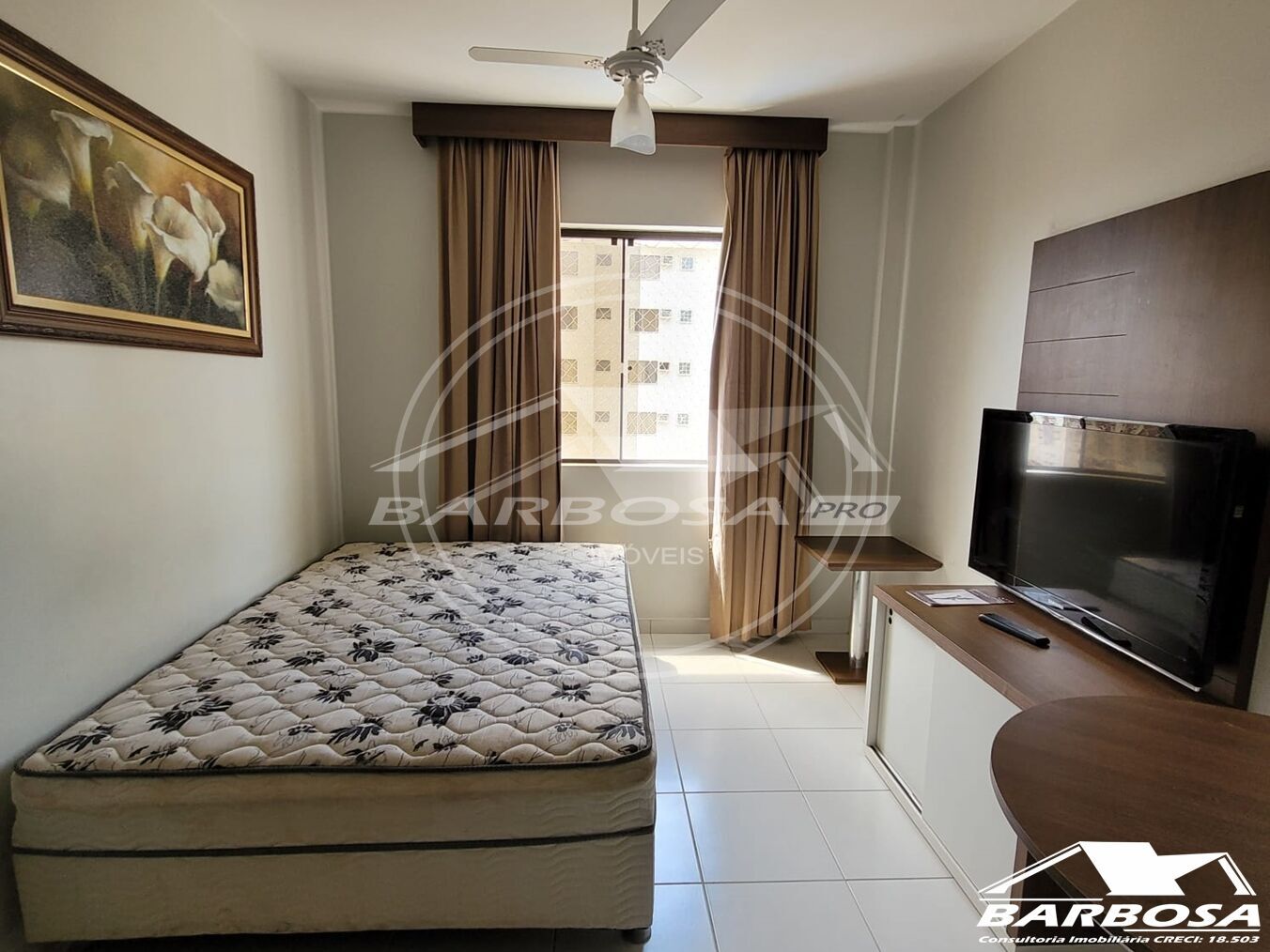 Excelente apartamento de 01 quarto, um banheiro social, sala de TV e cozinha.