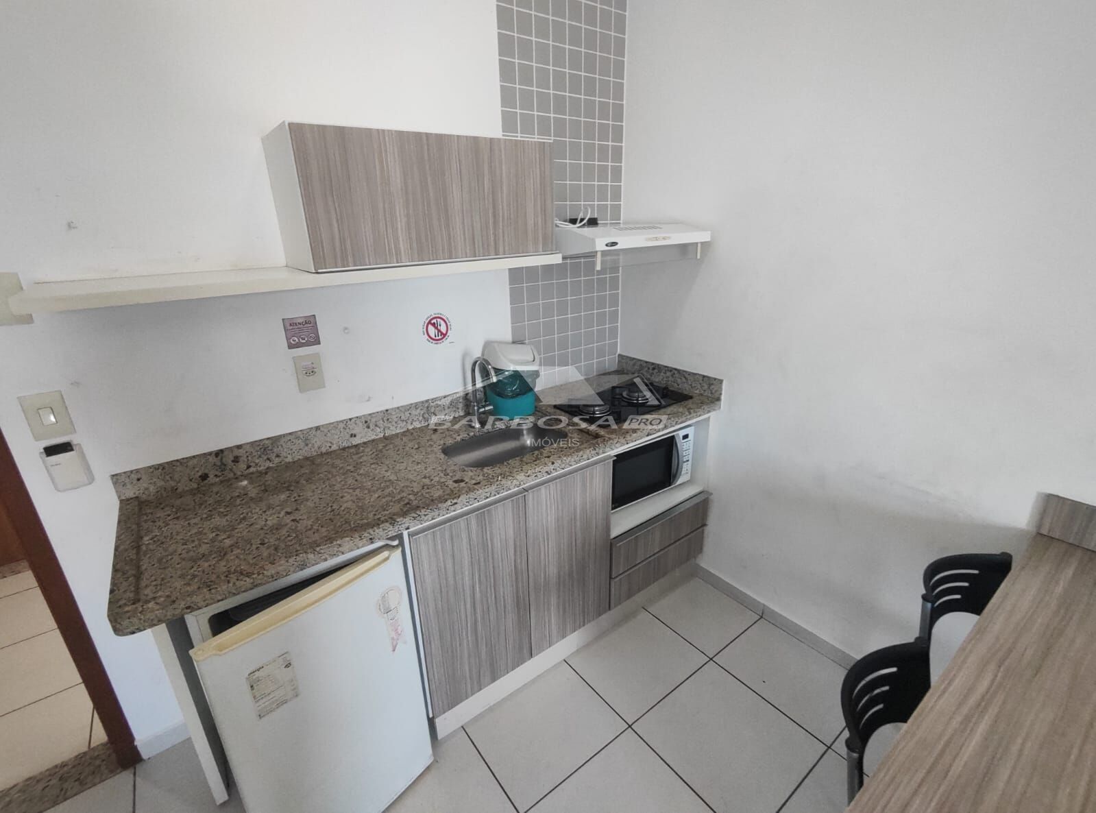 • Cozinha equipada com armários, cooktop e micro-ondas