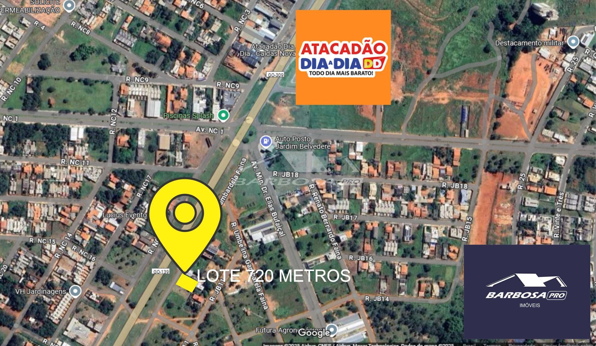 Liocalizado a poucos metros do Atacadão Dia Dia, este terreno fica de frente para a rodovia que dá acesso a Goiânia e São Paulo, entre outras cidades. Com grande fluxo de veículos, é um local altamente comercial.